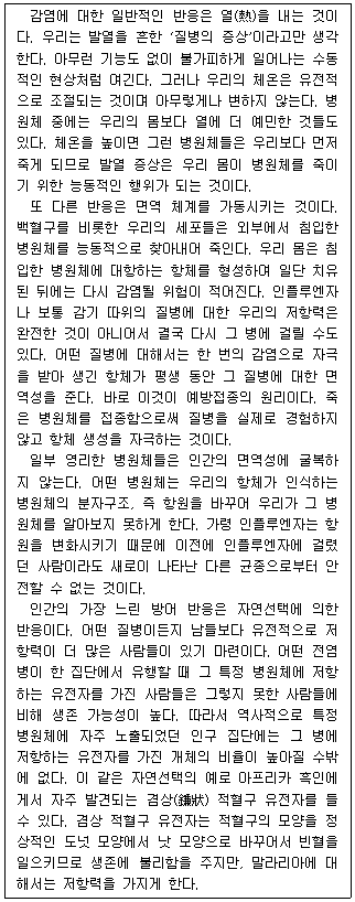 - 어떤 질병이 유행한 적이 없는 집단에서는 그 질병에 저항력을 주는 유전자가 보존되는 방향으로 자연선택이 이루어졌다.