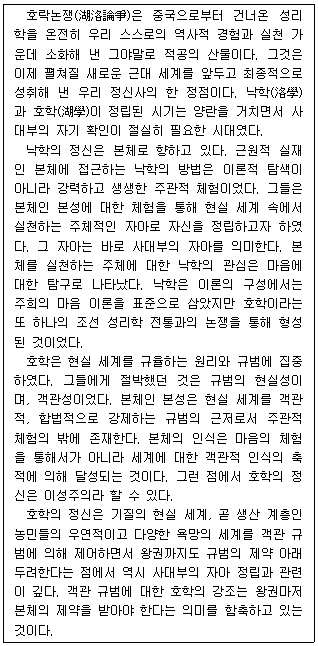 - ① 낙학이 본체를 주관적 체험 대상으로 보았던 반면, 호학은 본체를 규범의 근저로 보았다.