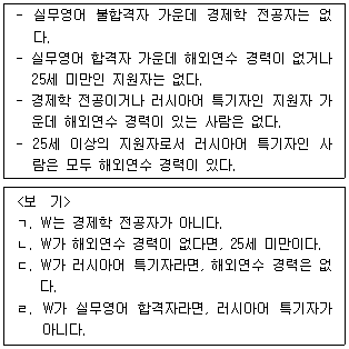 [과목 구분 없음] 입사 지원자들에 대한 다음 정보를 토대로 지원자 W에 관하여 바르게 추론한 것만을 <보기>에서 모두 고르면?(오류 신고가 접수된 문제입니다. 반드시 정답과 해설을 확인하시기 바랍니다.)