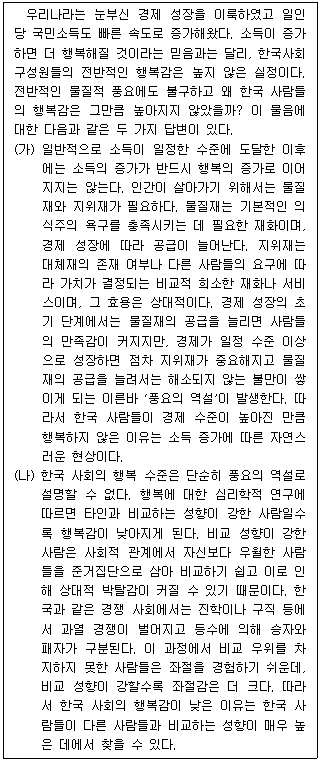 - ⑤ 자신보다 우월한 사람들을 준거집단으로 삼는 경향이 한국보다 강함에도 불구하고 행복감이 더 높은 나라가 있다는 사실은 (나)를 약화한다.