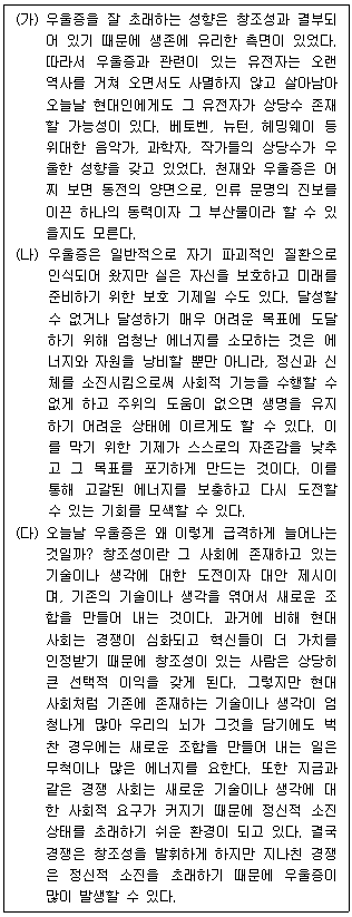 - ① 창조적인 사람들은 정서적으로 불안정하고 우울증에 걸릴 수 있는 유전자를 가질 확률이 높다는 사실은 (가)를 강화한다.