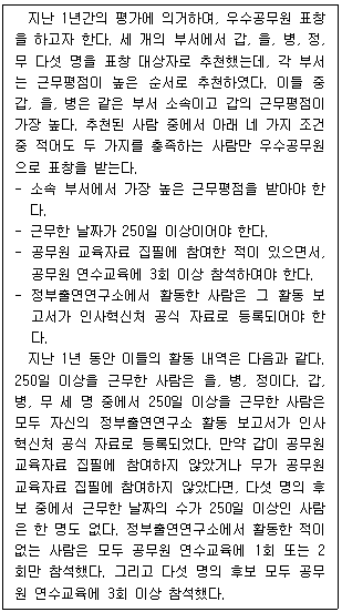 [과목 구분 없음] 다음 글의 내용이 참일 때, 우수공무원으로 반드시 표창 받는 사람의 수는?