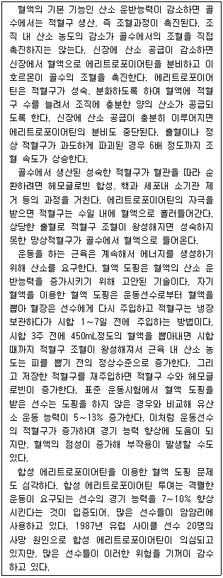 - ① 적혈구가 많아지는 것은 운동선수의 유산소 운동능력 향상에 도움이 된다.