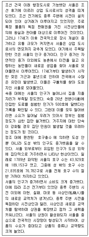 - ① 조선 후기에 상품 수요 및 소비 여력의 증대로 인하여 서울의 인구가 급증했다.