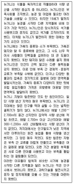 - ③ 뉴기니는 부족 간 교류가 매우 드물고 지형이 험준하여 외부에서 유입되는 유행병으로부터 비교적 안전하였다.
