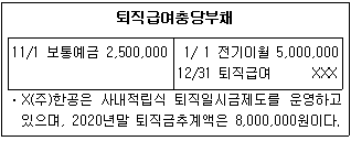 [과목 구분 없음] 다음 (주)한공의 2020년도 퇴직급여에 관한 자료이다. 이를 토대로 손익계산서에 계상할 퇴직급여 금액을 계산하면 얼마인가?