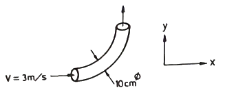 [가스유체역학] 직경이 10cm인 90° 엘보에 계기압력 2kgf/cm2 의 물이 3m/s로 흘러 들어온다. 엘보를 고정시키는데 필요한 x 방향의 힘은 약 몇 kgf 인가?