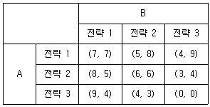 - (7, 7), (5, 8), (9, 4): A가 3, B가 2를 선택하는 경우, A는 2를 선택하는 것이 더 이익이므로 내쉬균형이 아니다.