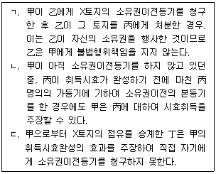 [민법(총칙,물권)] 甲이 乙명의의 X토지에 대하여 점유취득시효기간을 완성한 경우에 관한 설명으로 옳지 않은 것을 모두 고른 것은? (다툼이 있으면 판례에 따름)