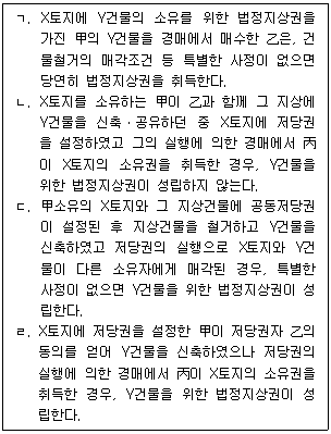- "ㄴ"은 옳은 설명이다. 법정지상권은 토지소유자가 가지는 권리로, 토지의 일부분을 공공목적으로 사용하기 위해 국가나 지방자치단체가 필요로 할 때, 소유자의 동의 없이 일정한 보상을 하고 그 일부분을 사용할 수 있는 권리를 말한다.