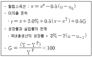 [경제학원론] A국의 중앙은행은 필립스곡선, 성장률과 실업률의 관계, 이자율 준칙에 따라 이자율을 결정한다. 현재 목표물가상승률이 2%, 자연실업률이 3%이고, 국내총생산은 잠재국내총생산, 물가상승률은 목표물가상승률, 그라고 실업률은 자연실업률과 같다고 가정할 때, 이에 관한 설명으로 옳지 않은 것은? (단, r, π, πe, πT, u, un, u-1, Y, YP는 각각 이자율, 물가상승률, 기대물가상승률, 목표물가상승률, 실업률, 자연실업률, 전기의 실업률, 국내총생산, 잠재국내총생산이다.)