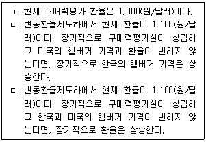 [경제학원론] 현재 한국과 미국의 햄버거 가격이 각각 5,000원, 5달러인 경우, 이에 관한 설명으로 옳은 것을 모두 고른 것은? (단, 햄버거를 대표상품으로 한다.)