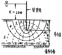 [토질 및 기초] 그림과 같은 경우의 투수량은? (단, 투수지반의 투수계수는 2.4⨉10-3cm/sec이다.)