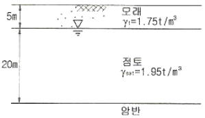 [토질 및 기초] 아래 그림과 같은 정규압밀점토지반에서 점토층 중간에서의 비배수 점착력은? (단, 소성지수는 50%임)