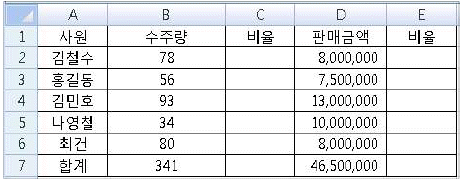 MS Excel의 워크시트에서 사원별 수주량과 판매금액, 그리고 수주량과 판매금액의 합계가 입력되어 있다. 이때 C열에는 전체 수주량 대비 각 사원 수주량의 비율을, E열에는 전체 판매금액 대비 각 사원 판매금액의 비율을 보이고자 한다. 이를 위해 C2셀에 수식을 입력한 다음에 이를 C열과 E열의 나머지 셀에 복사하여 사용하고자 한다. C2셀에 입력할 내용으로 옳은 것은?