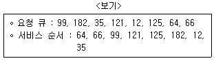 <보기>는 0 ~ 199번의 200개 트랙으로 이루어진 디스크 시스템에서, 큐에 저장된 일련의 입출력 요청들과 어떤 디스크 스케줄링(disk scheduling) 방식에 의해 처리된 서비스 순서이다. 이 디스크 스케줄링 방식은 무엇인가? 단, <보기>의 숫자는 입출력할 디스크 블록들이 위치한 트랙 번호를 의미하며, 현재 디스크 헤드의 위치는 트랙 50번이라고 가정한다.