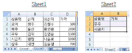 엑셀에서는 서로 다른 시트 사이에 셀 참조가 가능하다. 아래 그림에서 Sheet2의 시금치 가격을 VLOOKUP 함수를 사용하여 Sheet1에서 가져오고자 한다. 이를 위해 Sheet2의 B3 셀에 입력할 수식으로 알맞은 것은?