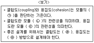 <보기>는 모듈화를 중심으로 한 소프트웨어 설계방법에 대한 설명이다. 빈칸의 내용을 올바르게 나열한 것은? (순서대로 ㉠, ㉡, ㉢, ㉣, ㉤)