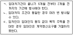 - "ㄱ" : 임차인은 임대차 계약 만료 6개월 전부터 계약 갱신을 요구할 수 있으며, 임대인은 이를 거절할 경우 계약 만료 1년 전까지 통지를 해야 한다. 이는 주택임대차보호법에서 규정한 임차인의 계약갱신요구권이다.