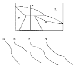 다음 2원계 합금의 포정형 상태도에서 X합금의 냉각곡선에 해당되는 것은?