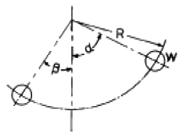 샤르피 충격시험시 시편의 흡수에너지 E의 측정원리는 그림과 같다. E의 계산식은 어떻게 표현되는가? (단, W : 충격시험에 사용되는 해머의 중량, R : 해머의 회전중심에서 무게중심까지의 거리, α : 들어올린 해머의 각도, β : 시험편 절단 후 올라간 해머의 각도)