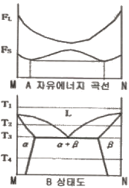 그림은 온도에 따른 자유에너지 곡선의 변화와 상태도의 관계를 나타낸 것이다. 그림 A에 나타낸 자유에너지 곡선(FL:액상, FS:고상)에 해당하는 온도는 그림 B에서 어디에 해당되는가?