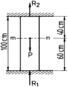 [기계가공법 및 안전관리] 그림과 같이 양단이 고정된 균일 단면봉에서 중간 m-n 단면의 중간점에 축하중 P 가 작용할 때 양단의 반력 R1과 R2는 각각 몇 N인가? (단, P = 1 kN 이다.)