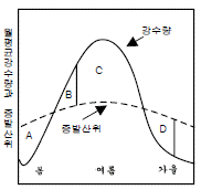 다음 그림은 한국의 어떤 지점의 연평균물수지를 나타내고 있다. 그림에서 D 부분은?