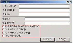아래 화면은 로컬 사용자 계정 만들기에서 '새 사용자' 대화상자이다. 기본적으로 '다음 로그온할 때 반드시 암호 변경(M)'에 체크되어 있다. Guest 계정 등과 같이 여러 사람이 하나의 계정을 사용할 때 어느 부분에 체크를 해야 하는가?