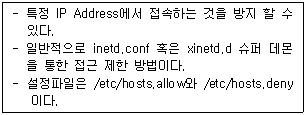 이 그림은 TCP_Wrapper의 기능을 설명하고 있다. TCP_Wrapper는 네트워크 보안을 강화하기 위해 사용되는 소프트웨어 중 하나로, 네트워크를 통해 접속하는 클라이언트의 IP 주소를 확인하고, 접속을 허용 또는 거부하는 역할을 한다. 이를 통해 불법적인 접근을 차단하거나, 보안상 취약한 서비스를 보호할 수 있다.