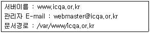 - ④ DomainName www.icqa.or.krAdminAddress webmaster@icqa.or.krDocumentPath /var/www/icqa.or.kr
