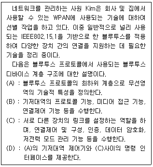 [네트워크 일반] 다음은 Home Network에 사용되는 기술 중 WPAN(Wireless Personal Area Network)에 대한 설명이다. (A)~(D)에 들어갈 계층을 순서대로 나열한 것은?