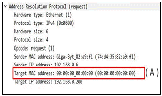 [TCP/IP] 네트워크 관리자 Kim 사원은 네트워크 환경의 안정성을 점검하기 위하여 네트워크 분석기를 통하여 ARP request packet를 캡쳐, 분석하였다. 다음 그림의 내용을 참조할 때, ARP 필드 내용의 Target MAC address (A)는 무엇을 의미하는 주소인가?