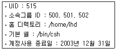 시스템관리자 홍길동은 useradd 명령어를 이용하여 ihd라는 새로운 사용자 계정을 다음과 같은 조건 으로 생성하려고 한다. 이를 위한 명령으로 알맞은 것은?