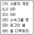 다음 중 패스워드 파일(/etc/passwd)에서 확인 할 수 있는 항목으로 묶여진 것은?