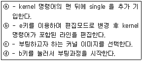 다음 중 리눅스 시스템에 문제가 발생하여 싱글 유저모드로 부팅하고자 할 때 grub 부트로더에서 작업해야할 순서로 알맞은 것은?