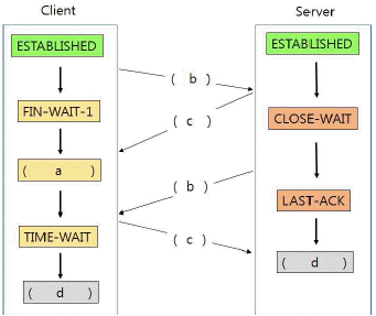 다음은 TCP/IP 모델에서 Client와 Server간의 회선 흐름도 이다. 빈칸에 들어갈 내용으로 알맞은 것은? (a-b-c-d 순)