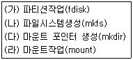 리눅스시스템에서 하드디스크를 추가하여 사용 하고자 한다. 사용목적에 맞는 명령어와 그 옵션으로 짝지은 것으로 알맞은 것은?