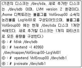 리눅스시스템에서 LVM(Logical Volume Manager)로 구성된 /home 디렉토리의 용량이 부족하여 추가로 디스크를 구성하여 용량을 늘리고자 한다. 이 작업에 해당되는 순서로 알맞은 것은?