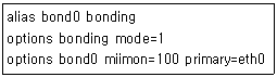 리눅스 환경에서 네트워크 인터페이스 카드 2개로 이중화 구성을 하기 위하여 bond0 인터페이스를 정의하였다. 이후 /etc/modprobe.conf 파일에 다음과 같은 내용을 추가하였다. bond0 인터페이스를 실제 생성하기 위한 명령어로 알맞은 것은? (단, 명령어를 실행하는 작업 디렉토리에는 파일이 존재하지 않는다.)