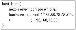 다음은 DHCP 서버에서 특정 호스트에게 고정된 IP 주소를 할당하기 위한 설정이다. ( 괄호 )안에 들어갈 내용으로 알맞은 것은?