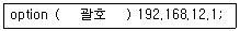 [네트워크 및 서비스의 활용] 다음은 dhcpd.conf에서 게이트웨이 주소를 지정하는 항목이다. ( 괄호 ) 안에 들어갈 내용으로 알맞은 것은?