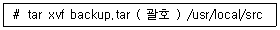 [리눅스 운영 및 관리] 다음은 묶여있는 tar 파일을 /usr/local/src 디렉터리에 푸는 과정이다. ( 괄호 ) 안에 들어갈 내용으로 알맞은 것은?