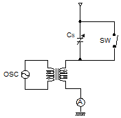 다음 그림과 같은 방법으로 공중선의 실효 정전용량을 측정하고 할 경우 처음 S를 닫고 OSC를 조정하여 공중선에 공진 시킬 때 주파수가 2[㎒] 이였으며 S를 열고 Cs를 조정하여 공진상태로 하였을 때 그 주파수가 4[㎒]이었다면 이 공중선의 실효 정전용량은 얼마인가?