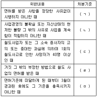 [물류관련법규] 철도사업법령상 국토교통부장관의 철도사업자에 대한 행정처분의 기준 중 ( )안에 들어갈 내용이 옳지 않은 것은?(문제 오류로 모두 정답처리 되었습니다. 여기서는 1번을 누르면 정답 처리 됩니다.)