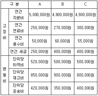 - 연간 처리물동량이 1만 톤일 때는 고정비만 비교하여 물류시설 입지를 선정한다.