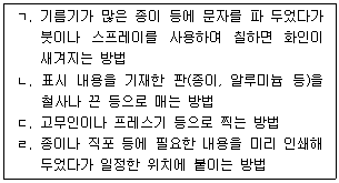 정답은 "ㄱ: 스텐실(Stencil), ㄴ: 태그(Tag), ㄷ: 스탬핑(Stamping), ㄹ: 레이블링(Labeling)"입니다.