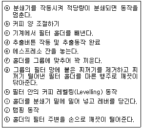 [커피 추출] 다음 은 에스프레소 추출 동작들이다. 올바른 순서대로 정렬한 것은?