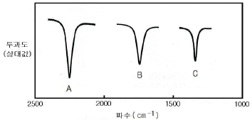 스펙트럼 A, B, C에 해당하는 화합물을 순서대로 옳게 나열한 것은? (단, 파수(cm-1)는 파장의 역수이다.)