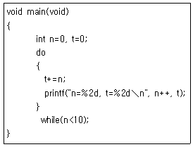 다음 C프로그램에서 최종적으로 출력되는 n, t의 값을 순서대로 나열하면?